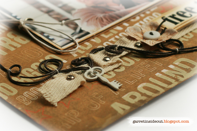 Тут основная бумага с текстом, некоторые надписи фактурные, частями бархатные и очень приятные тактильно. Использована киперная лента, брадсы, пуговки, подвески ключик и бабочка, две росинки, цветочек, люверс.. Надпись приподнята на объемный скотч. Края затонированы чернилами "винтаж фото".